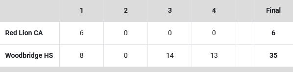 Jordan Evans had 2 touchdowns including a 90-yard kickoff return for the unbeaten Woodbridge Blue Raiders. They win 35-6 against Red Lion.