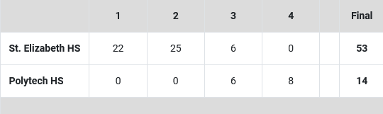 St. Elizabeths rolled to a 53-14 win Friday night over Polytech. Quasim Benson scored three first-half touchdowns and Gavin Andrews scored twice including one 70-yard run. The Vikings are 9-0 in Class 1A with Class 2A Caravel, which is 8-1, remaining on the last day of the regular season.
